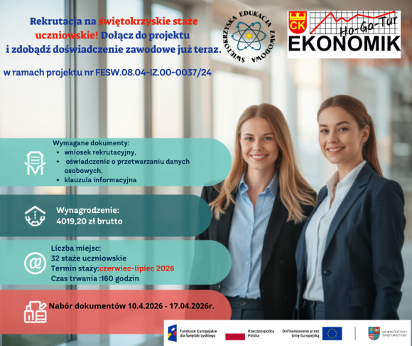 Zespół Szkół Ekonomicznych w Kielcach ogłasza nabór uczniów i uczennic Technikum Nr 5 do udziału w płatnych stażach uczniowskich realizowanych w ramach projektu